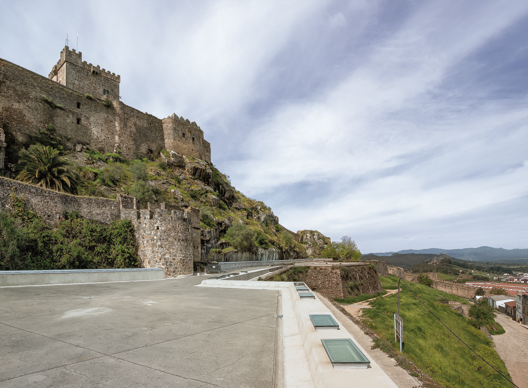 surgir entre el uso residencial de la hospedería y el cultural del castillo. La intervención se realiza en la línea fortificada del “Recinto de los Portugueses”, situada en la parte baja del castillo. Se resuelve el proyecto